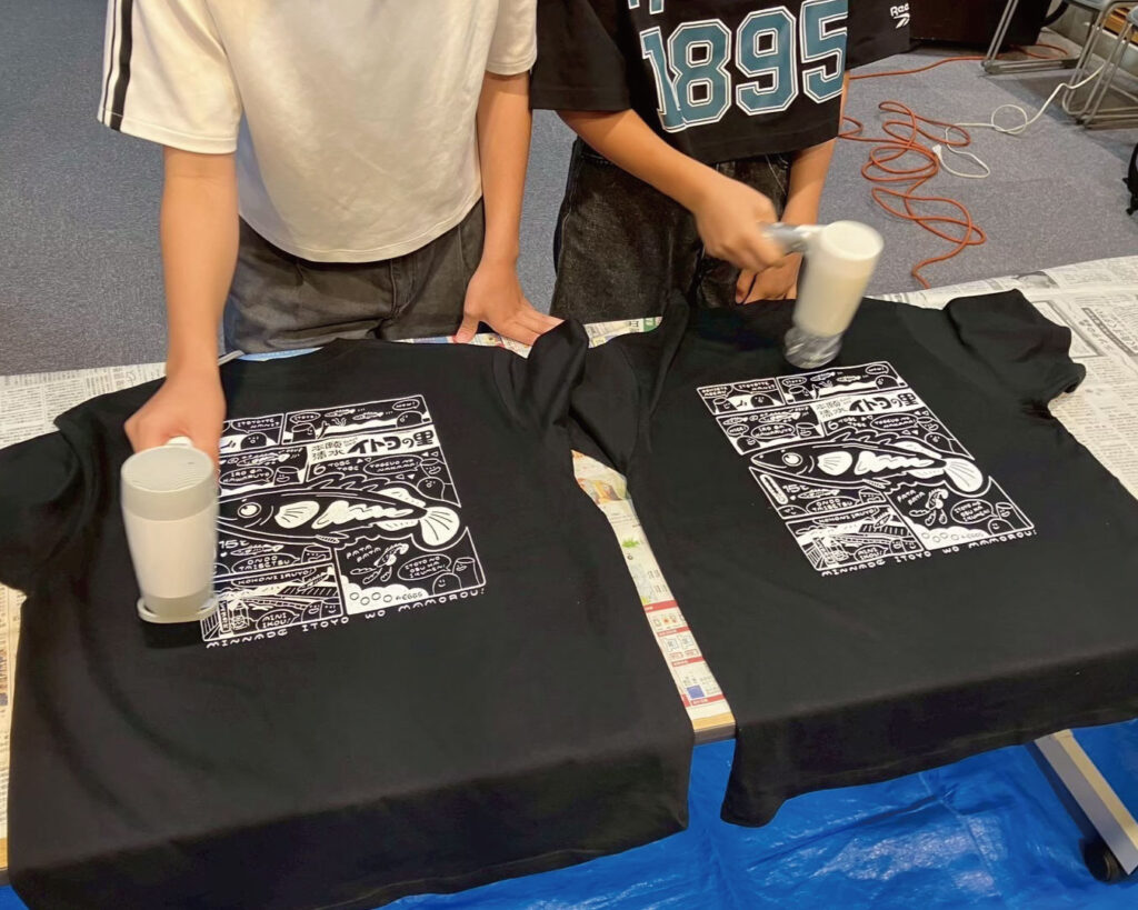 イトヨ守り隊のTシャツは、ワークショップ形式で制作。メンバーの皆さん一人ひとりの手で、シルクスクリーンでプリントしてもらいました。