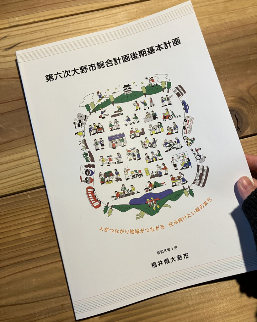 令和8年4月1日からスタートする「第六次大野市総合計画後期基本計画」の冊子に掲載するメインビジュアルイラストを描かせていただきました。表紙にあしらっているイラストは、冊子中面でも使用いただいています。計画策定に関わる公募委員としても参加させていただきましたが、市の大きな方針や計画がどのように決まっていくのか、その片鱗を知れる貴重な時間でした。